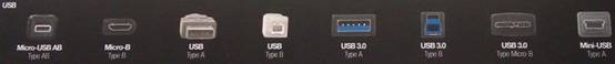 Razne vrste USB priključaka (kliknite za povećanje). S lijeva na desno: Micro USB Type AB, Micro USB Tip B, USB 2.0 Tip A, USB 2.0 Tip B, USB 3.0 Tip A, USB 3.0 Tip B, USB 3.0 Tip Micro B, Min USB priključak tipa A.